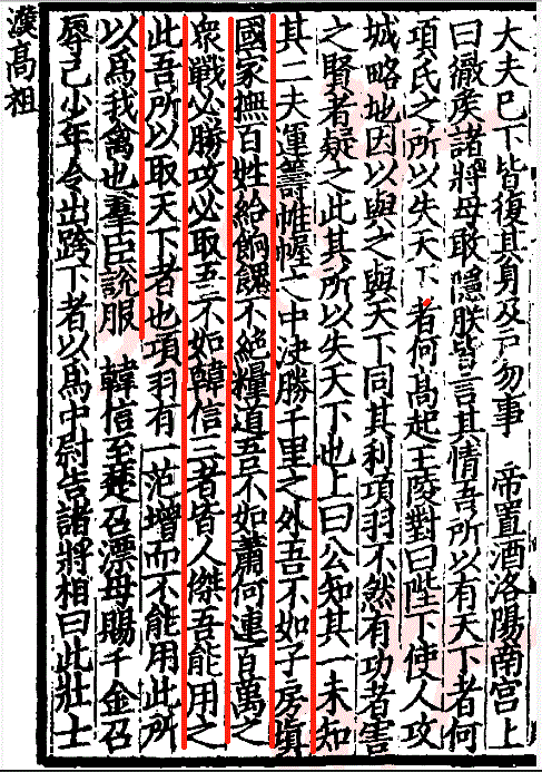 上曰:“公知其一,未知其二。夫運籌帷幄之中,決勝千里之外,吾不如子房;填國家撫百姓給餉餽,不絶糧道,吾不如蕭何;連百萬之衆,戰必勝、攻必取,吾不如韓信。三者皆人傑,吾能用之,此吾所以取天下者也。