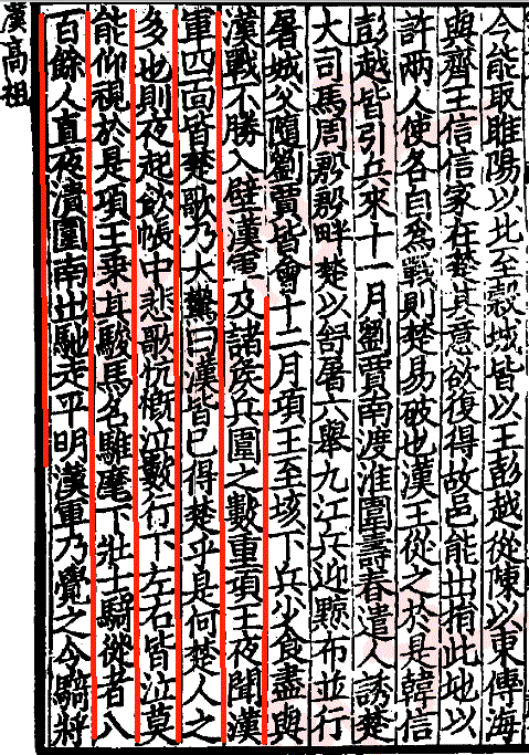 十二月項王至垓下,兵少食盡,與漢戰不勝,入壁。漢軍及諸侯兵圍之數重。項王夜聞漢軍四靣皆楚歌,乃大驚曰:漢皆已得楚乎?是何楚人之多也。則夜起,飲帳中,悲歌忼慨泣數行下,左右皆泣,莫能仰視。於是項王乗其駿馬名騅麾下壯士,騎從者八百餘人,直夜潰圍南出,馳走平明。