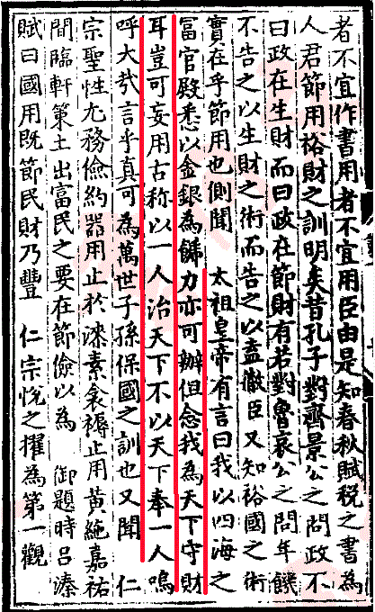 (宋)太祖皇帝有言曰:“我以四海之富,宫殿悉以金銀為餙,力亦可辦。但念我為天下守財耳,豈可妄用。古称以一人治天下,不以天下奉一人”。