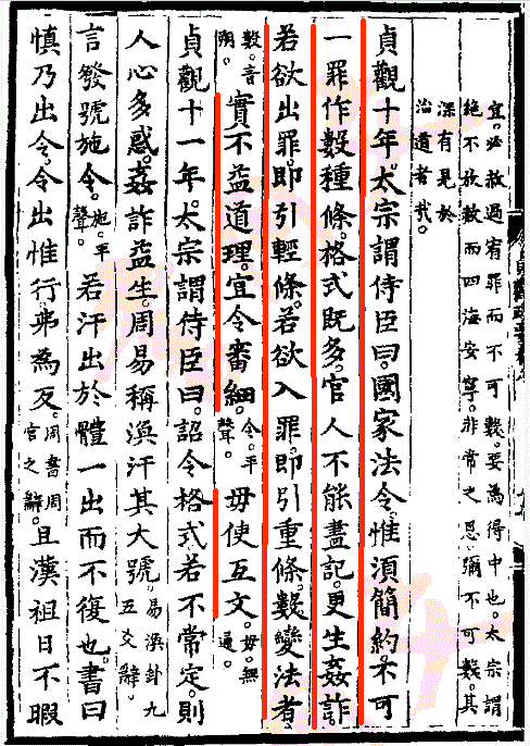 貞觀十年太宗謂侍臣曰:國家法令惟須簡約,不可一罪作數種條格式,既多官人不能盡記,更生姦詐。若欲出罪即引輕條,若欲入罪即引重條數變法者,實不益道理,宜令審細毋使互文。