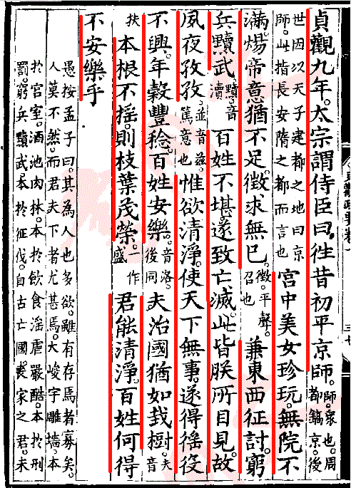 貞觀九年太宗謂侍臣曰:徃昔初平京師,宫中美女珍玩無院不滿。煬帝意猶不足,徴求無已,兼東西征討,窮兵黷武,百姓不堪遂致亡滅。此皆朕所目見,故夙夜孜孜,惟欲清淨,使天下無事。遂得徭役不興,年榖豐稔,百姓安樂。夫治國猶如栽樹,本根不摇則枝葉茂榮。君能清淨百姓,何得不安樂乎!