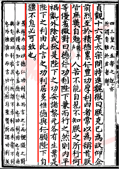 貞觀十六年,太宗問特進魏徴曰:“朕克己為政,仰企前烈,至於積德、累仁、豐功、厚利四者,常以為稱首。朕皆庶幾自勉,人苦不能自見,不知朕之所行何等優劣”。徴對曰:“德仁功利陛下兼而行之,然則内平禍亂,外除戎狄是陛下之功;安諸黎元各有生業,是陛下之利,由此言之功利居多。惟德與仁,願陛下自强不息,必可致也”。