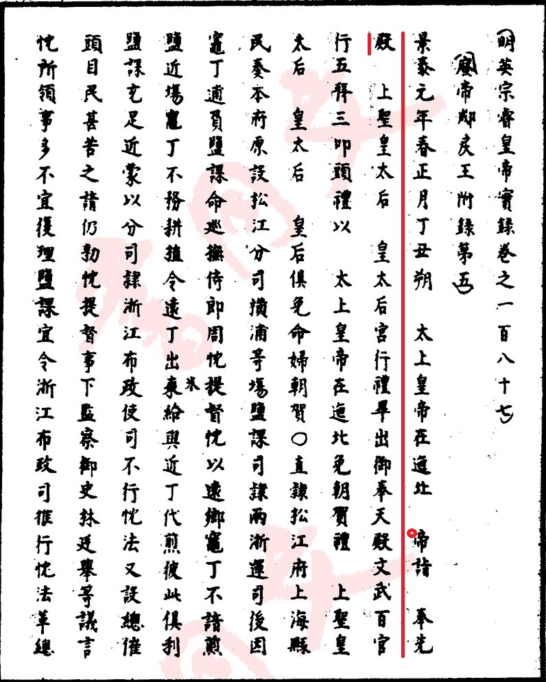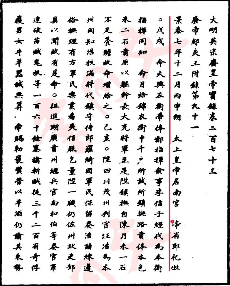 英宗朱祁镇在抗击蒙古瓦刺部内侵的土木堡战役中被俘,蒙古人长驱直入,兵临北京城下,朝廷大臣遂拥立英宗之弟郕王朱祁钰为皇帝,是为代宗景泰皇帝。景泰七年,已放归北京的“太上皇朱祁镇发动政变,夺回了帝位,改元天顺。从此,代宗被贬为戾王。景泰七年的历史,在英宗之子宪宗修的《英宗实录》中,也被作为“废帝郕戾玉附录”,附在正统朝之后,由于有以上的复杂背景,因此《英宗实录》的修纂过程,就出现了一些波折。