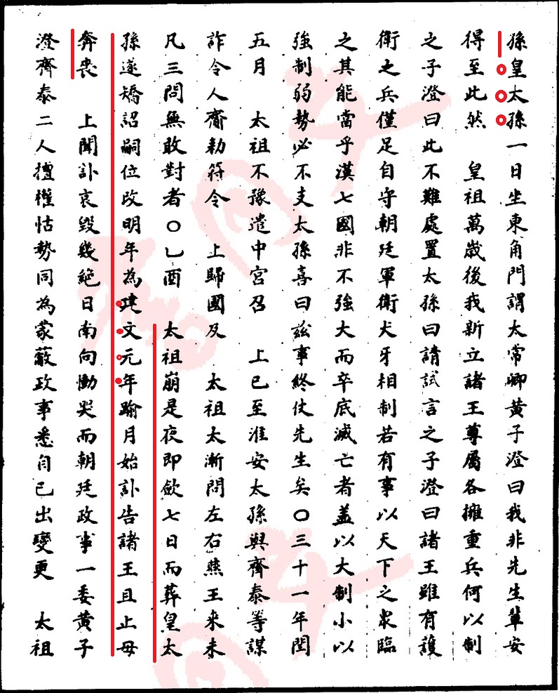 《太祖实录》经过三次修纂。前两次所修的书稿都被朱棣销毁,第三次改修后的《太祖实录》遂成为定本,它就是我们今天所看到的样子。然而,今本《太宗实录》前附有“洪武三十二至三十五年”共四年的史事,这是万历时补修的朱允炆建文朝的历史。本来,深知“灭其朝必先去其史”的朱棣,一再篡改《太祖实录》,就是想要消除朱允炆的影响并粉饰自己,为此,他甚至削去建文年号,将建文元年至四年改为洪武三十二至三十五年。然而,纸包不住火,雪掩不住人,历史是无法删除和篡改的,从英宗时开始,便直有许多仗义直言的文臣如王祖嫡、杨守陈、焦竑、李清等为建文鸣不平,要求恢复建文年号并改纂建文朝实录。据柷允明的《野记》所载,英宗时,张太皇太后大渐,召三杨于榻前,问朝廷尚有何大事未办者?杨士奇提出了三件事,其中之一是“建庶人虽已灭,曾临御四年,当命史官修起一朝《实录》,仍用建文之号”。太皇太后说:“历日已革除之,岂可复用?” 杨士奇答道:“历日行于一时,《实录》万世信史,岂可蒙洪武之年以乱实?” 结果“后颔之”。但祝允明的《野记》可信度不大,不过它反映出一个信息,即明代受直书教育的史臣们对明成祖朱棣去建文之史的做法早就不满。成化至弘治时,詹事杨守陈在史馆曾说:“古人谓国可灭,史不可灭...... 太宗靖内难,其后史臣不纪建文君事,遂使建文数年朝廷政事,及当时忠于所事者,皆湮没不传。及今采辑,尚可补国史之缺。”但这些建议都没有获得批准。