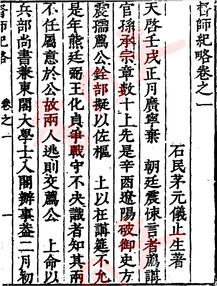 茅元仪立志报国,目睹明廷阉党弄权,国运衰落,武备废弛状况,于焦急忧愤之时,发奋著书立说,刻苦钻研历代兵法理论,将多年搜集的战具、器械资料,治国平天下的方略,辑成《武备志》,于天启元年(1621)刻印。自此以后,这位年轻学子声名大振,以知兵之名被任为赞画,随大学士孙承宗(高阳公)督师辽东,与同僚鹿善继、袁崇焕、孙元化等人一起,在山海关内外考察地形,研究敌情,协助孙承宗作战,抵御后金的进攻,并到江南筹集战舰,加强辽东水师,提高明军的战斗力。在孙承宗指挥下,明军在辽东收复九城四十五堡,茅元仪也因功荐为翰林院待诏。《督师紀略》就是记述随孙承宗督师辽东,加固边防之事。