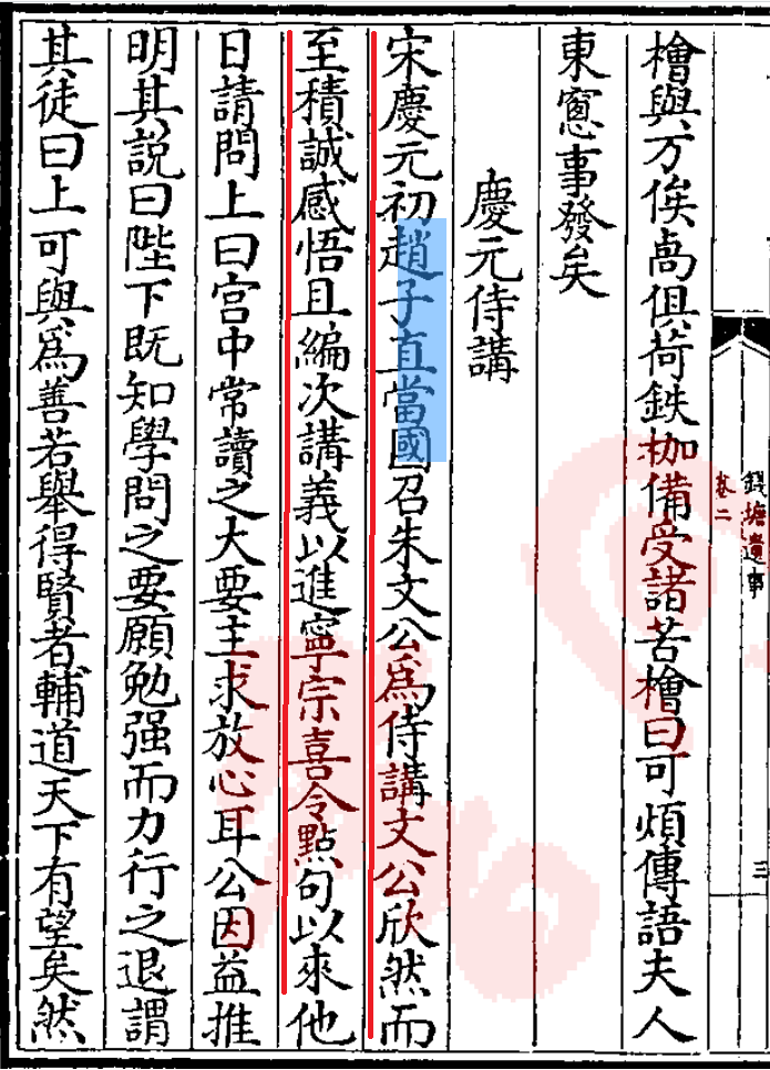 这件事尚保留有比较早期的记载,《两朝纲目备要》卷3光宗绍熙五年十月辛丑“是日命朱熹讲大学”之下载: