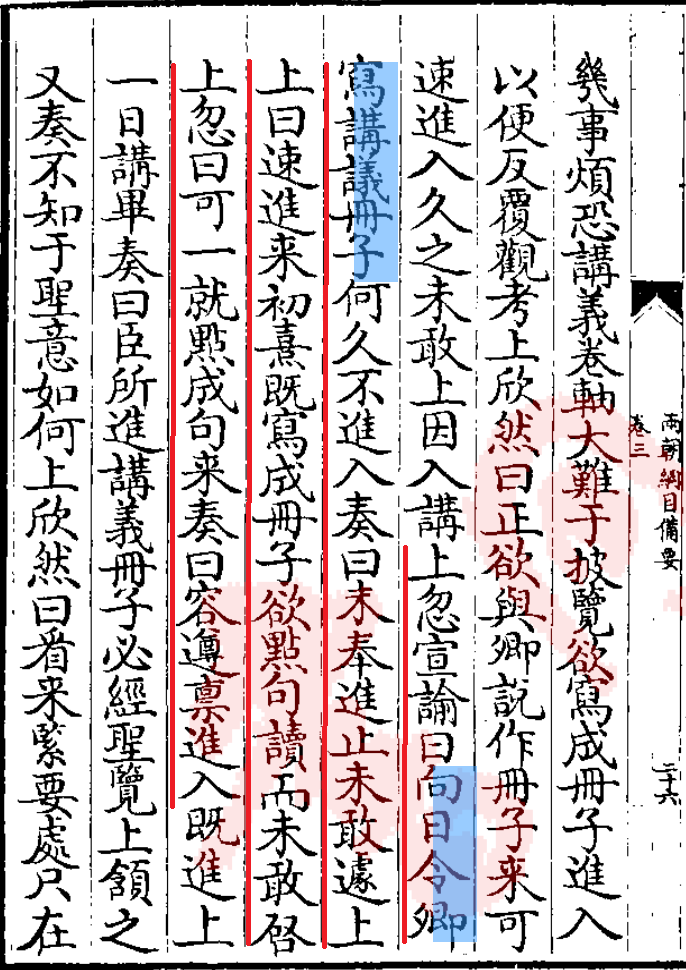 这段原始史料很有意思,可圈可点。第一,反映了宁宗阅读文章,需要有标点;第二,反映了朱夫子并不迂腐,他遵照宁宗的指示,把讲义写好后,本想施以标点,但担心损伤宁宗的自尊心,让臣下觉得宁宗读不懂无标点的文章。由于有这样的顾虑,朱熹迟迟未将讲义进呈,直到宁宗催问,并明确讲,要他“点成句来”,朱熹才放心地将讲义加上句读进呈。