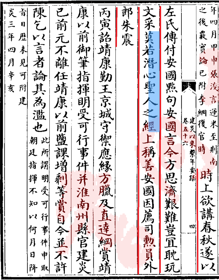 时上欲讲《春秋》,遂以《左氏传》付安国点句。安国言:“今方思济艰难,岂宜耽玩文采?莫若潜心圣人之经。”上称善。安国因荐司勋员外郎朱震。