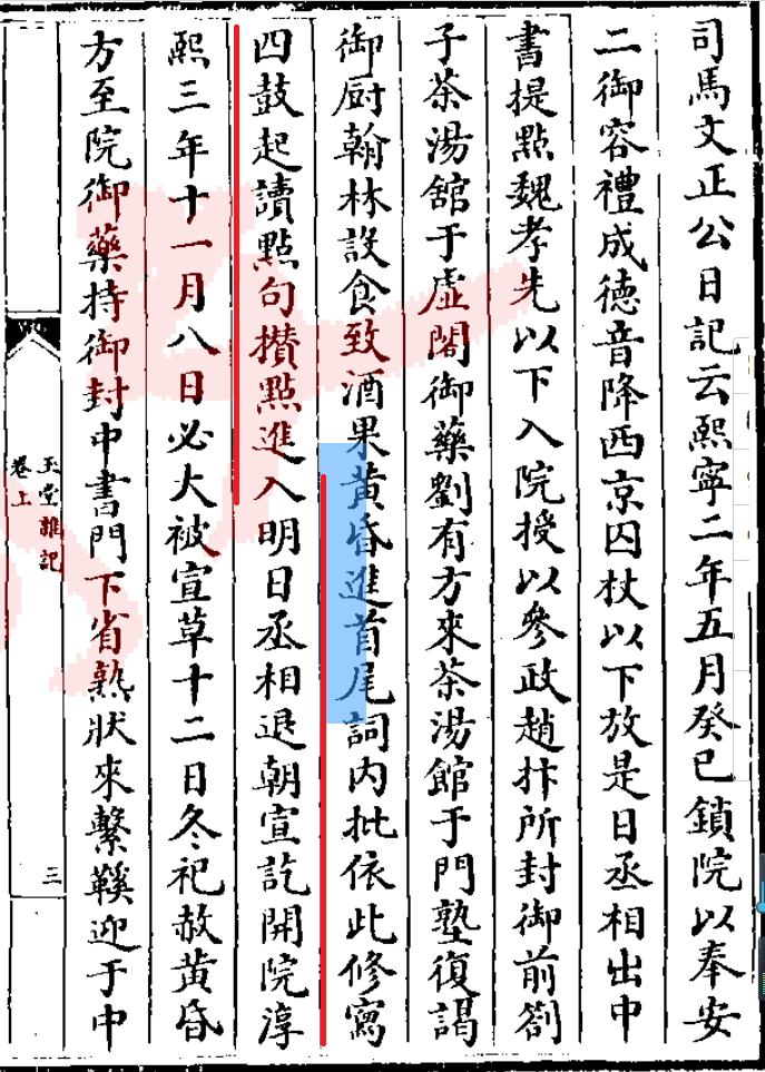 周必大《玉堂杂记》卷上引述司马光《日记》云:“黄昏进首尾词,内批:依此修写,四鼓起读,点句攒点进入。”
