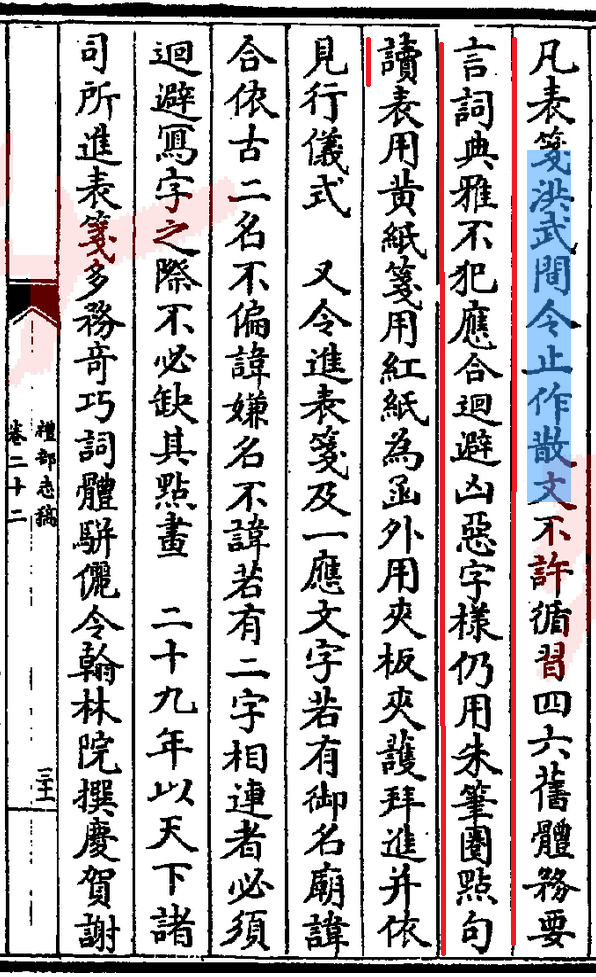 凡表笺,洪武间令止作散文,不许循习四六旧体,务要言词典雅,不犯应合回避凶恶字样,仍用朱笔圈点句。