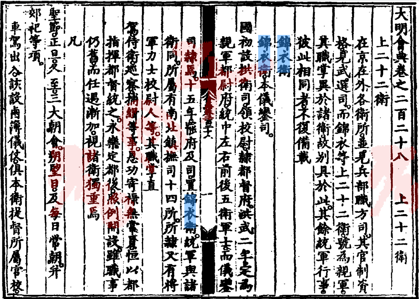 锦衣卫是明朝上二十二卫之一,为明太祖朱元璋设立的“拱卫司”,后改称“亲军都尉府”,统辖仪鸾司,掌管皇帝仪仗和侍卫。首要职责是皇帝的侍卫亲军和仪仗队,由将军、校尉和力士组成。洪武十五年(1382年),裁撤亲军都尉府与仪鸾司,改置锦衣卫。作为皇帝侍卫的军事机构,锦衣卫主要职能为“掌直驾侍卫、巡查缉捕”,其首领称为锦衣卫指挥使,具有军政搜集情报机构之责,一般由皇帝的亲信或武将担任(不能是太监),直接向皇帝负责,可以逮捕任何人,包括皇亲国戚,并进行不公开的审讯。不过锦衣卫指挥使大多没有好下场,每个皇帝上台锦衣卫都得大清洗一遍。