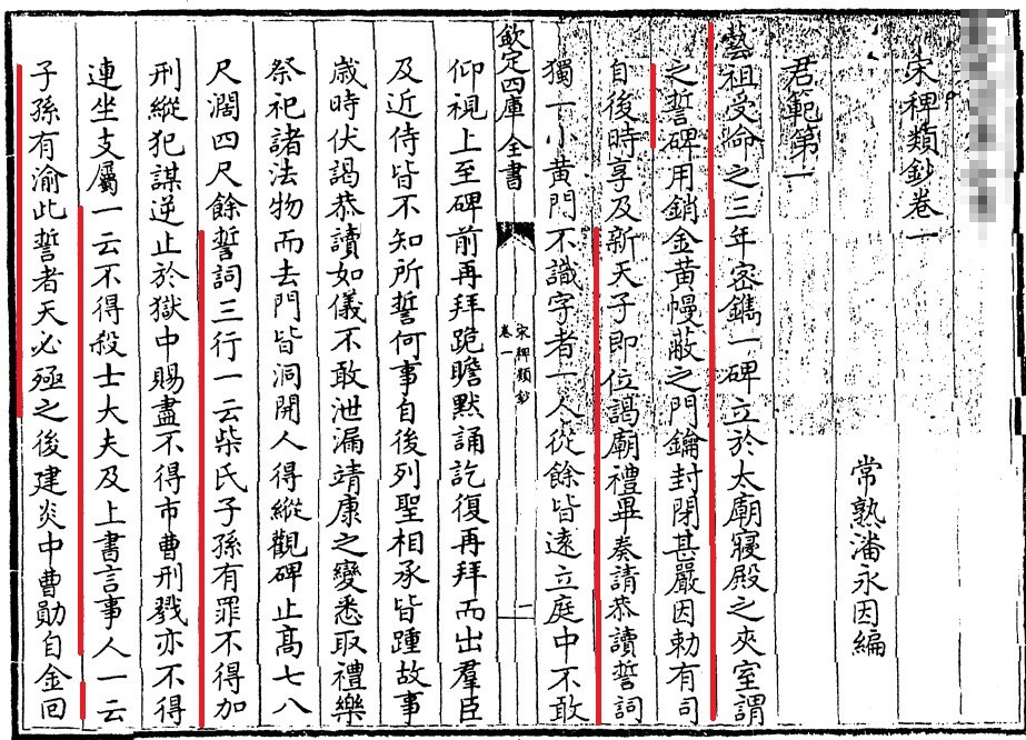 倒是后来清人潘永因所著《宋稗类钞》记载颇详:称帝后第3年,命人密刻一碑立在太庙寝殿的一间“夹室”之内,称“誓碑”。此后四时祭祀及新皇即位,须恭读誓词。宋历任皇帝皆承故例,按时恭读,不敢泄漏。直到靖康之变,宫人四散,宫门洞开,有人这才看到誓碑内容,碑上书:
