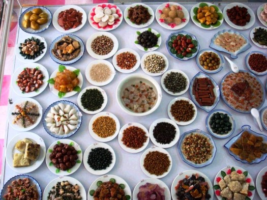 砌香咸酸一行:香药木瓜、椒梅、香药花、砌香樱桃、紫苏奈香、砌香萱花柳儿、砌香葡萄、甘草花儿、姜丝梅、梅肉饼儿、水红姜、杂丝梅饼儿。
