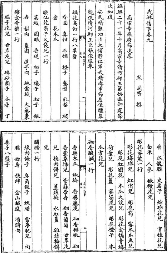 书中第九卷《武林旧事 · 高宗幸张府节次略》详细地记述了一道道从零食小点到宴席正餐吃的喝的食单,应有尽有,不要说吃,看着都眼晕。