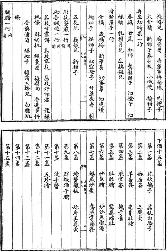 时新果子一行:金橘、咸杨梅、新罗葛、切蜜蕈、切脆枨、榆柑子、新椰子、切宜母子、藕铤儿、甘蔗柰白香、新柑子、梨五花子。