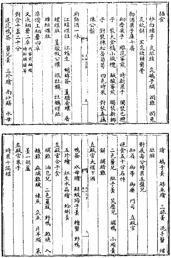 对食十盏二十分:莲花鸭签、茧儿羹、三珍脍、南炒鳝、水母脍、鹌子羹、 鱼脍、三脆羹、洗手蟹、炸肚。